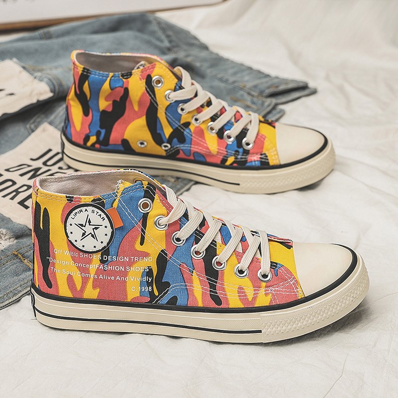 This pair of high-top canvas shoes features a vibrant color-block camouflage design, perfectly combining style and comfort. Made with premium canvas, the upper is breathable and durable, ensuring all-day comfort. The rubber sole offers excellent slip resistance, making it suitable for both daily wear and outdoor activities. The bright colors and unique patterns add a pop of style, ideal for consumers seeking a personalized look. These canvas shoes pair effortlessly with jeans, shorts, or skirts, showcasing a trendy and distinctive charm, making them an excellent choice for your everyday outfits.