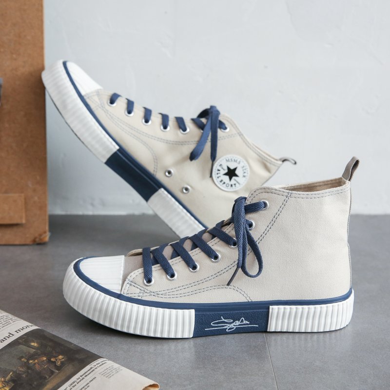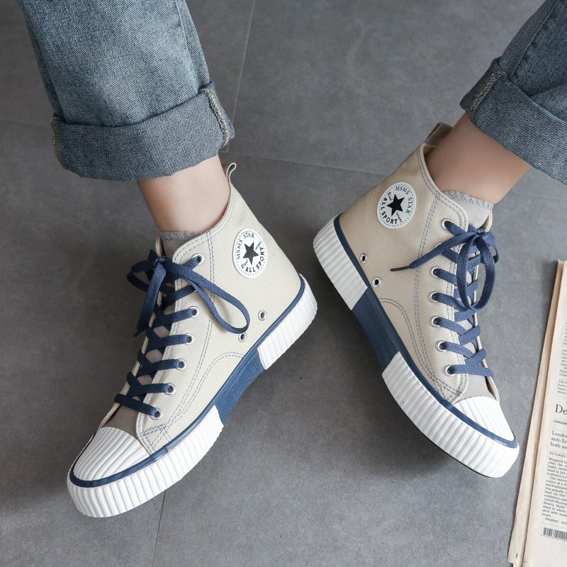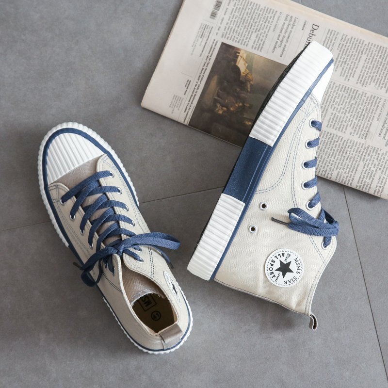 These vintage high-top canvas shoes feature a soft beige tone complemented by deep navy laces and a textured rubber sole, offering a simple yet elegant fashion statement. The premium canvas upper provides breathability and comfort, making them perfect for extended wear. Reinforced toe caps and anti-slip rubber soles ensure stability and durability, allowing confident strides in any setting. Whether for casual outings, street fashion, or campus style, these versatile sneakers effortlessly pair with various looks, making them a must-have wardrobe staple.